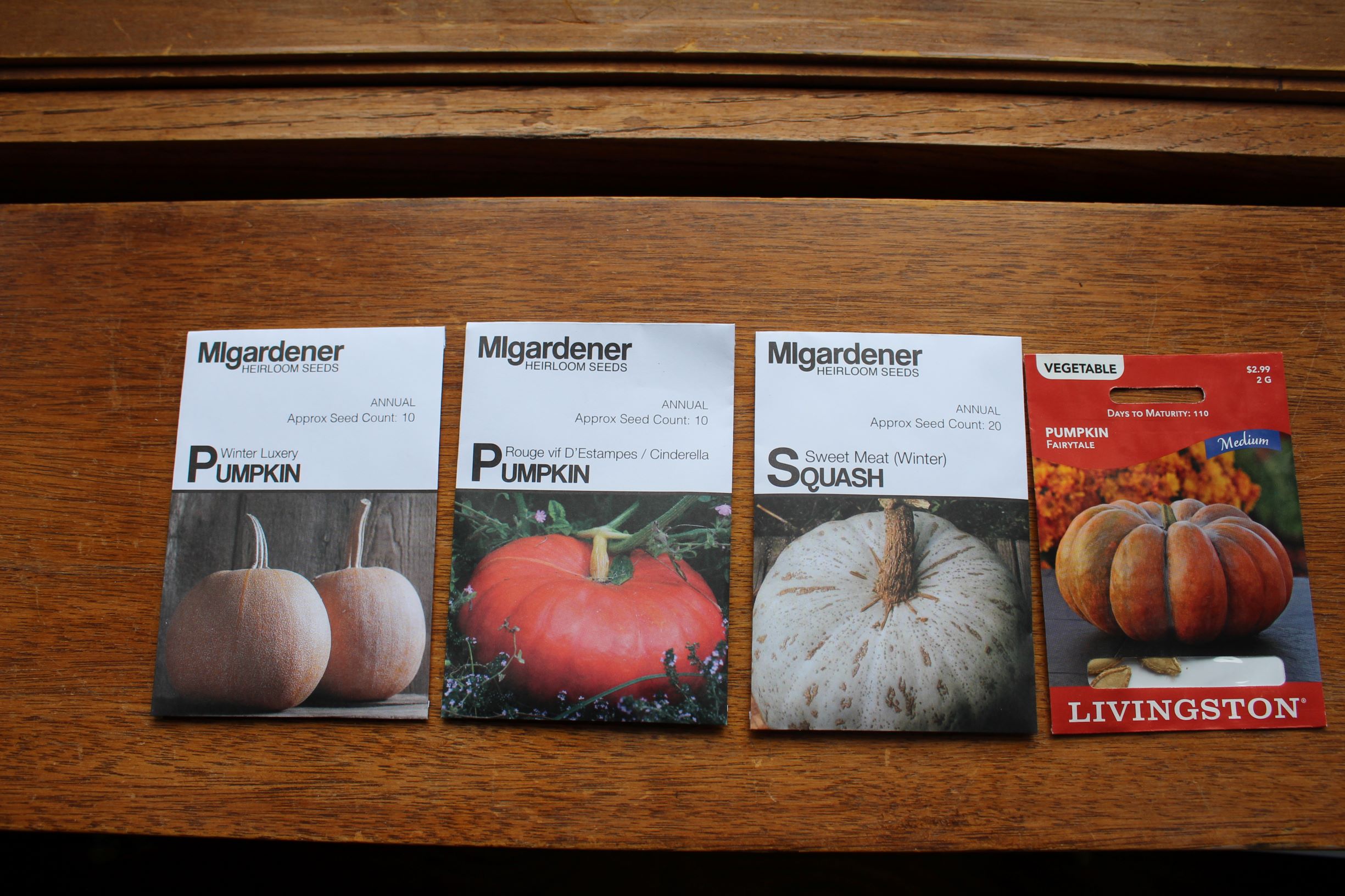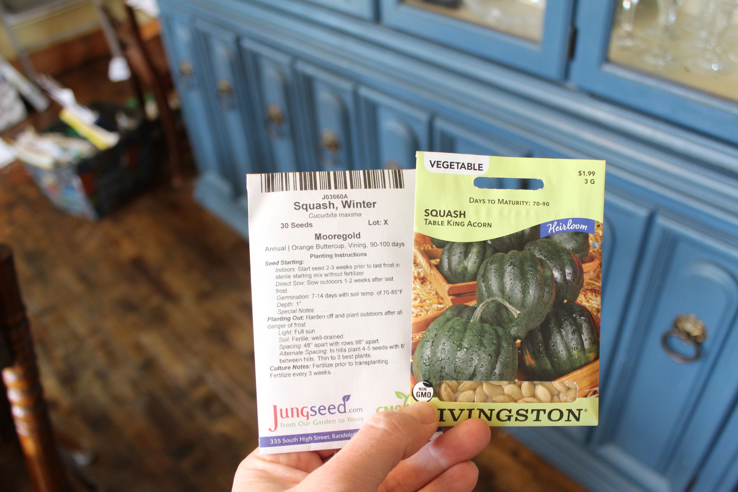 Mooregold Squash from Jung’s– A friend gifted me these seeds after she made a quick run to Jungs for her mom to purchase Mooregold Seeds. True friends give seeds, right? She said it is one of her mom’s favorites and it almost always sells out. I was very thankful and am excited to try growing it. After looking at the seed description, this pumpkin-like winter squash is a good keeper.